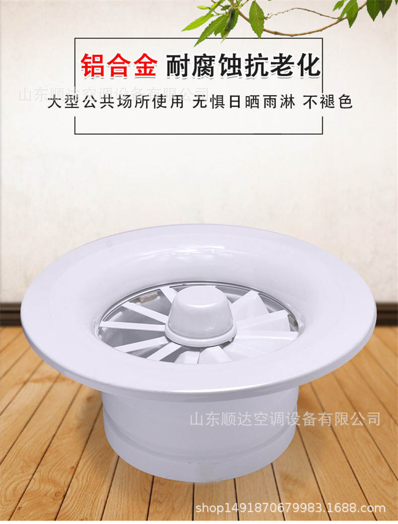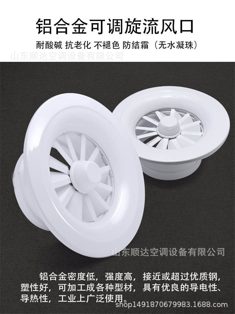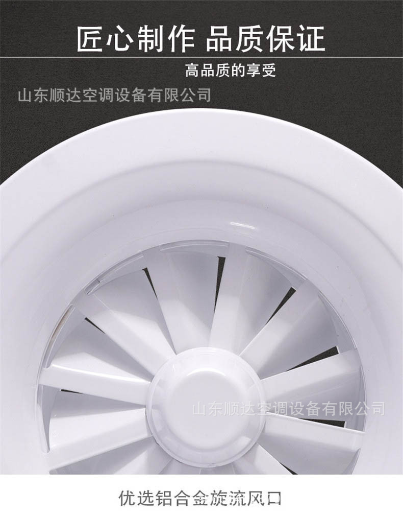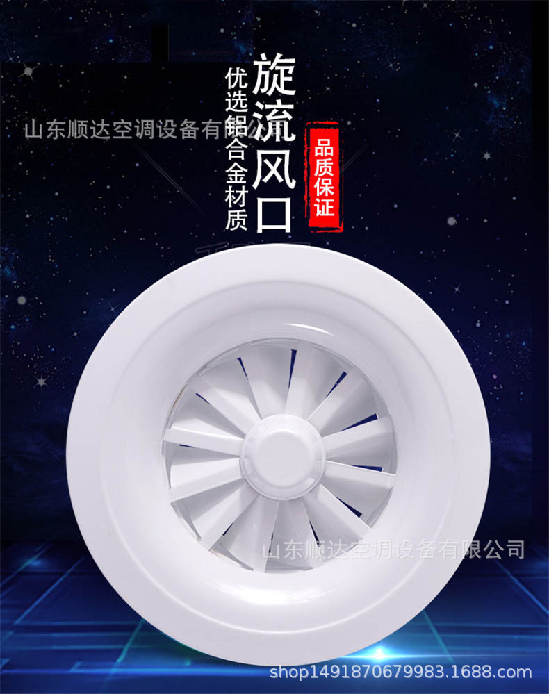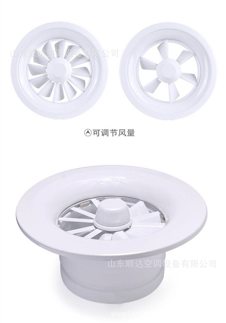 旋流風(fēng)口是空調(diào)系統(tǒng)中的一個(gè)排風(fēng)工具。在空調(diào)通風(fēng)系統(tǒng)中可用作大風(fēng)量,大溫差送風(fēng)以減少風(fēng)口數(shù)量,安裝在天花板或頂棚上,可用于3米以?xún)?nèi)低空間,也可用二種高度大面積送風(fēng),高度甚至可達(dá)10米以上。